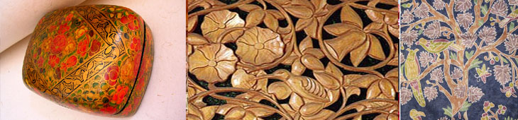 Besides at least three different grades of Papier Mache, there are some cheaper versions in cardboard or wood available too. To make Papier Mache, first paper is soaked in water till it disintegrates. It is then pounded, mixed with an adhesive solution, shaped over moulds, and allowed to dry and set before being painted and varnished. Paper that has been pounded to pulp has the smoothest finish in the final product. The designs painted on objects of Papier Mache are brightly colored. They vary in artistry and the choices of colors. Gold is used on most objects, either as the only color, or as the highlight for certain motifs, and besides the finish of the product, it is the quality of the gold used which determines the price.